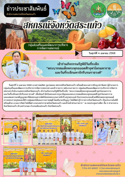 วันศุกร์ที่ 4 เมษายน 2568 นางสาวสมจิตร ภูผาพลอย สหกรณ์จังหวัดสระแก้ว พร้อมด้วยนางสาววชิรญาณ์ พิมพร ผู้อำนวยการกลุ่มส่งเสริมและพัฒนาการบริหารการจัดการสหกรณ์ และข้าราชการ พนักงานราชการ กลุ่มส่งเสริมและพัฒนาการบริหารการจัดการสหกรณ์ สำนักงานสหกรณ์จังหวัดสระแก้ว เข้าร่วมกิจกรรมรัฐพิธีวันที่ระลึก “พระบาทสมเด็จพระพุทธยอดฟ้าจุฬาโลกมหาราช และวันที่ระลึกมหาจักรีบรมราชวงศ์” เพื่อน้อมรำลึกในพระมหากรุณาธิคุณของพระบาทสมเด็จพระพุทธยอดฟ้าจุฬาโลกมหาราชและแสดงความกตัญญูกตเวทีต่อพระมหากษัตริย์แห่งพระบรมราชจักรีวงทุกพระองค์ กิจกรรมประกอบด้วยพิธีสวดพระพุทธมนต์ถวายพระราชกุศลและพิธีวางพุ่มดอกไม้และถวายราชสดุดี โดยมีนายปริญญา โพธิสัตย์ ผู้ว่าราชการจังหวัดสระแก้ว เป็นประธานในพิธี พร้อมด้วย นางเยาวรัตน์ โพธิสัตย์ นายกเหล่ากาชาดจังหวัดสระแก้ว และหัวหน้าส่วนราชการ " ณ หอประชุมปางสีดา ชั้น 2 ศาลากลางจังหวัดสระแก้ว ตำบลท่าเกษม อำเภอเมืองสระแก้ว จังหวัดสระแก้ว
