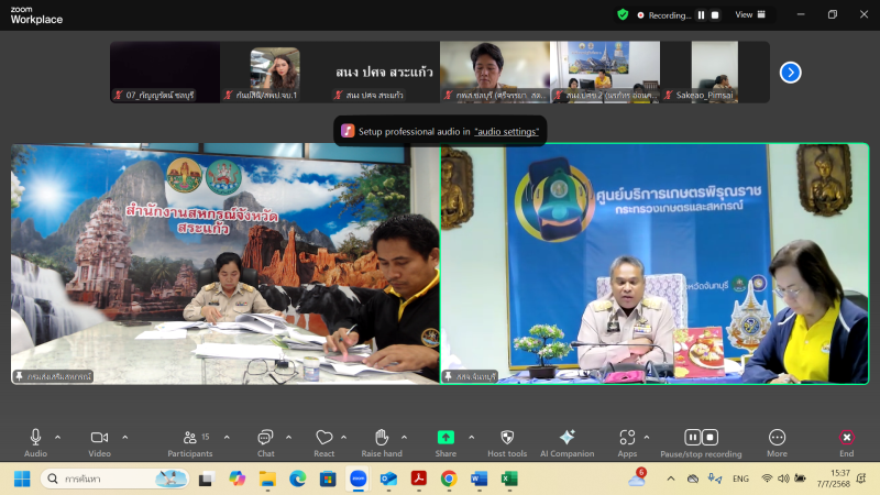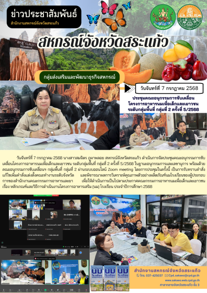 วันจันทร์ที่ 7 กรกฎาคม 2568 นางสาวสมจิตร ภูผาพลอย สหกรณ์จังหวัดสระแก้ว ดำเนินการจัดประชุมคณะอนุกรรมการขับเคลื่อนโครงการอาหารนมเพื่อเด็กและเยาวชน ระดับกลุ่มพื้นที่ กลุ่มที่ 2 ครั้งที่ 5/2568 ในฐานะอนุกรรมการและเลขานุการ พร้อมด้วย คณะอนุกรรมการขับเคลื่อนฯ กลุ่มพื้นที่ กลุ่มที่ 2 ผ่านระบบออนไลน์ Zoom meeting โดยการประชุมในครั้งนี้ เป็นการรับทราบคำสั่งแก้ไขเพิ่มคำสั่งแต่งตั้งคณะทำงานระดับจังหวัด และพิจารณาผลการวิเคราะห์คุณภาพตัวอย่างผลิตภัณฑ์นมโรงเรียนของผู้ประกอบการ ของสำนักงานคณะกรรมการอาหารและยา เพื่อให้ดำเนินการเป็นไปตามประกาศคณะกรรมการอาหารนมเพื่อเด็กและเยาวชน เรื่อง หลักเกณฑ์และวิธีการดำเนินงานโครงการอาหารเสริม (นม) โรงเรียน ประจำปีการศึกษา 2568