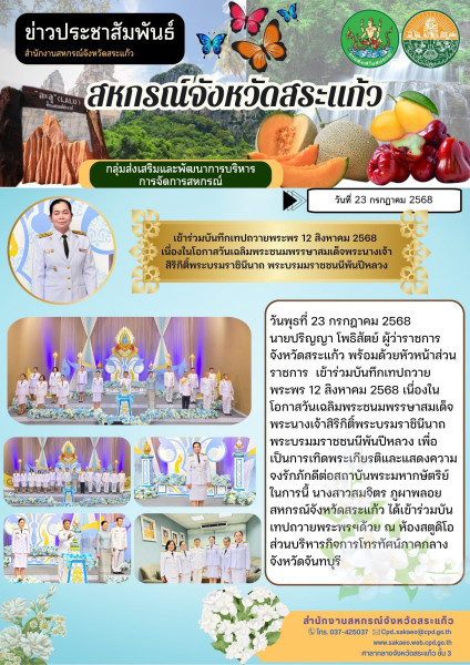 วันพุธที่ 23 กรกฎาคม 2568 นายปริญญา โพธิสัตย์ ผู้ว่าราชการจังหวัดสระแก้ว พร้อมด้วยหัวหน้าส่วนราชการ เข้าร่วมบันทึกเทปถวายพระพร 12 สิงหาคม 2568 เนื่องในโอกาสวันเฉลิมพระชนมพรรษาสมเด็จพระนางเจ้าสิริกิติ์พระบรมราชินีนาถ พระบรมมราชชนนีพันปีหลวง เพื่อเป็นการเทิดพระเกียรติและแสดงความจงรักภักดีต่อสถาบันพระมหากษัตริย์ ในการนี้ นางสาวสมจิตร ภูผาพลอย สหกรณ์จังหวัดสระแก้ว ได้เข้าร่วมบันเทปถวายพระพรฯด้วย ณ ห้องสตูดิโอส่วนบริหารกิจการโทรทัศน์ภาคกลาง จังหวัดจันทบุรี