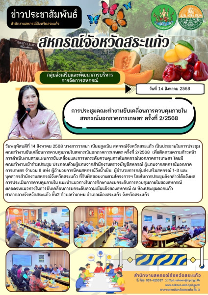 วันพฤหัสบดีที่ 14 สิงหาคม 2568 นางสาววาสนา เนียมสูงเนิน สหกรณ์จังหวัดสระแก้ว เป็นประธานในการประชุมคณะทำงานขับเคลื่อนการควบคุมภายในสหกรณ์นอกภาคการเกษตร ครั้งที่ 2/2568 เพื่อติดตามความก้าวหน้าการดำเนินงานตามแผนการขับเคลื่อนและการยกระดับควบคุมภายในสหกรณ์นอกภาคการเกษตร โดยมี คณะทำงานเข้าร่วมประชุม ประกอบด้วยผู้แทนจากสำนักงานตรวจบัญชีสหกรณ์ ผู้แทนจากสหกรณ์นอกภาคการเกษตร จำนวน 9 แห่ง ผู้อำนวยการนิคมสหกรณ์วังน้ำเย็น ผู้อำนวยการกลุ่มส่งเสริมสหกรณ์ 1-3 และบุคลากรสำนักงานสหกรณ์จังหวัดสระแก้ว ที่รับผิดชอบงานตามโครงการฯ โดยในการประชุมดังกล่าวได้แจ้งผลการประเมินการควบคุมภายใน แนะนำแนวทางในการรักษาและยกระดับการควบคุมภายในของสหกรณ์ ตลอดจนแนวทางในการขับเคลื่อนการยกระดับความเข้มแข็งของสหกรณ์ ณ ห้องประชุมดอกเเก้ว ศาลากลางจังหวัดสระแก้ว ชั้น 2 ตำบลท่าเกษม อำเภอเมืองสระเเก้ว จังหวัดสระเเก้ว