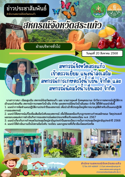 วันพุธที่ 20 สิงหาคม 2568 นางสาววาสนา เนียมสูงเนิน สหกรณ์จังหวัดสระแก้ว และนายภาณุพงศ์ รังคพุทธมานะ นักวิชาการสหกรณ์ปฏิบัติการ เข้าแนะนำส่งเสริม สหกรณ์การเกษตรวังน้ำเย็น จำกัด และสหกรณ์นิคมวังน้ำเย็นสอง จำกัด ได้ให้คำแนะนำดังนี้