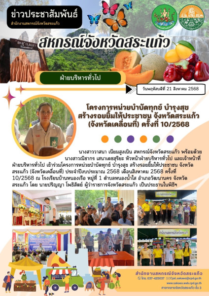 วันพฤหัสบดีที่ 21 สิงหาคม 2568 นางสาววาสนา เนียมสูงเนิน สหกรณ์จังหวัดสระแก้ว พร้อมด้วย นางสาวณิชากร เสนาเดชสุริยะ หัวหน้าฝ่ายบริหารทั่วไป และเจ้าหน้าที่ฝ่ายบริหารทั่วไป เข้าร่วมโครงการหน่วยบำบัดทุกข์ บำรุงสุข สร้างรอยยิ้มให้ประชาชน จังหวัดสระแก้ว (จังหวัดเคลื่อนที่) ประจำปีงบประมาณ 2568 เดือนสิงหาคม 2568 ครั้งที่ 10/2568 ณ โรงเรียนบ้านหนองเรือ หมู่ที่ 1 ตำบลหนองน้ำใส อำเภอวัฒนานคร จังหวัดสระแก้ว โดย นายปริญญา โพธิสัตย์ ผู้ว่าราชการจังหวัดสระแก้ว เป็นประธานในพิธีฯ