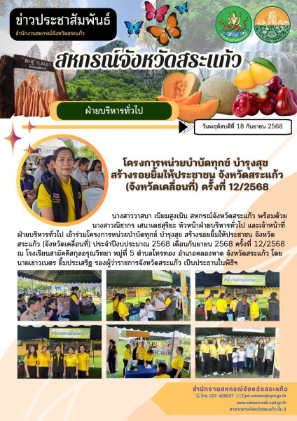วันพฤหัสบดีที่ 18 กันยายน 2568 นางสาววาสนา เนียมสูงเนิน สหกรณ์จังหวัดสระแก้ว พร้อมด้วย นางสาวณิชากร เสนาเดชสุริยะ หัวหน้าฝ่ายบริหารทั่วไป และเจ้าหน้าที่ฝ่ายบริหารทั่วไป เข้าร่วมโครงการหน่วยบำบัดทุกข์ บำรุงสุข สร้างรอยยิ้มให้ประชาชน จังหวัดสระแก้ว (จังหวัดเคลื่อนที่) ประจำปีงบประมาณ 2568 เดือนกันยายน 2568 ครั้งที่ 12/2568 ณ โรงเรียนสามัคคีสกุลอรุณวิทยา หมู่ที่ 5 ตำบลไทรทอง อำเภอคลองหาด จังหวัดสระแก้ว โดย นายเชาวเนตร ยิ้มประเสริฐ รองผู้ว่าราชการจังหวัดสระแก้ว เป็นประธานในพิธีฯ