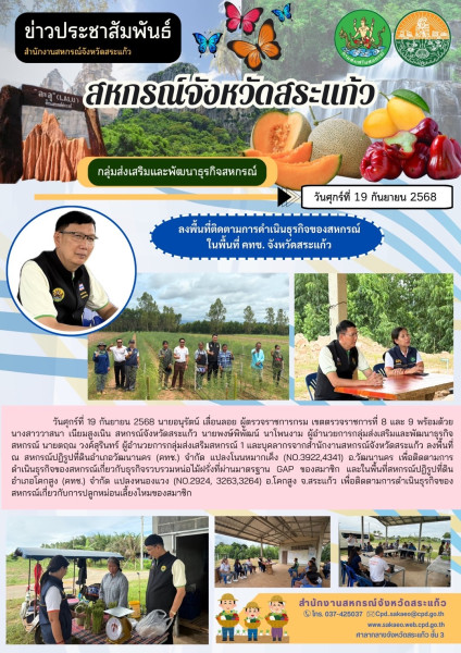 วันศุกร์ที่ 19 กันยายน 2568 นายอนุรัตน์ เลื่อนลอย ผู้ตรวจราชการกรม เขตตรวจราชการที่ 8 และ 9 พร้อมด้วย นางสาววาสนา เนียมสูงเนิน สหกรณ์จังหวัดสระแก้ว นายพงษ์พิพัฒน์ นาโพนงาม ผู้อำนวยการกลุ่มส่งเสริมและพัฒนาธุรกิจสหกรณ์ นายตฤณ วงค์สุรินทร์ ผู้อำนวยการกลุ่มส่งเสริมสหกรณ์ 1 และบุคลากรจากสำนักงานสหกรณ์จังหวัดสระแก้ว ลงพื้นที่ ณ สหกรณ์ปฏิรูปที่ดินอำเภอวัฒนานคร (คทช.) จำกัด แปลงโนนหมากเค็ง (NO.3922,4341) อ.วัฒนานคร เพื่อติดตามการดำเนินธุรกิจของสหกรณ์เกี่ยวกับธุรกิจรวบรวมหน่อไม้ฝรั่งที่ผ่านมาตรฐาน GAP ของสมาชิก และในพื้นที่สหกรณ์ปฏิรูปที่ดินอำเภอโคกสูง (คทช.) จำกัด แปลงหนองแวง (NO.2924, 3263,3264) อ.โคกสูง จ.สระแก้ว เพื่อติดตามการดำเนินธุรกิจของสหกรณ์เกี่ยวกับการปลูกหม่อนเลี้ยงไหมของสมาชิก