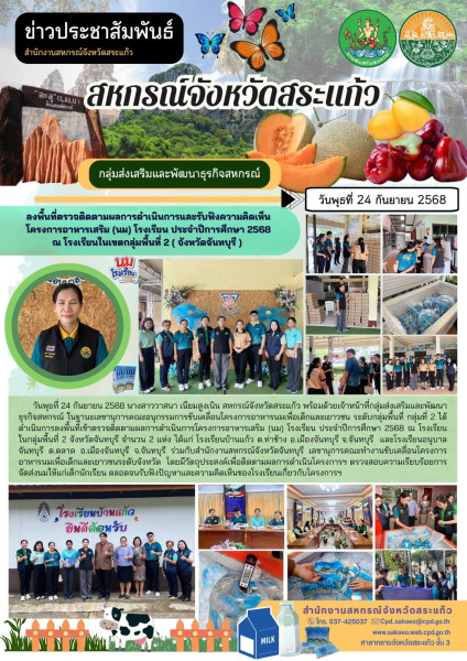 วันพุธที่ 24 กันยายน 2568 นางสาววาสนา เนียมสูงเนิน สหกรณ์จังหวัดสระแก้ว พร้อมด้วยเจ้าหน้าที่กลุ่มส่งเสริมและพัฒนาธุรกิจสหกรณ์ ในฐานะเลขานุการคณะอนุกรรมการขับเคลื่อนโครงการอาหารนมเพื่อเด็กและเยาวชน ระดับกลุ่มพื้นที่ กลุ่มที่ 2 ได้ดำเนินการลงพื้นที่เข้าตรวจติดตามผลการดำเนินการโครงการอาหารเสริม (นม) โรงเรียน ประจำปีการศึกษา 2568 ณ โรงเรียนในกลุ่มพื้นที่ 2 จังหวัดจันทบุรี จำนวน 2 แห่ง ได้แก่ โรงเรียนบ้านแก้ว ต.ท่าช้าง อ.เมืองจันทบุรี จ.จันทบุรี และโรงเรียนอนุบาลจันทบุรี ต.ตลาด อ.เมืองจันทบุรี จ.จันทบุรี ร่วมกับสำนักงานสหกรณ์จังหวัดจันทบุรี เลขานุการคณะทำงานขับเคลื่อนโครงการอาหารนมเพื่อเด็กและเยาวชนระดับจังหวัด โดยมีวัตถุประสงค์เพื่อติดตามผลการดำเนินโครงการฯ ตรวจสอบความเรียบร้อยการจัดส่งนมให้แก่เด็กนักเรียน ตลอดจนรับฟังปัญหาและความคิดเห็นของโรงเรียนเกี่ยวกับโครงการฯ