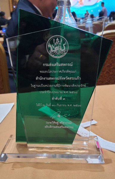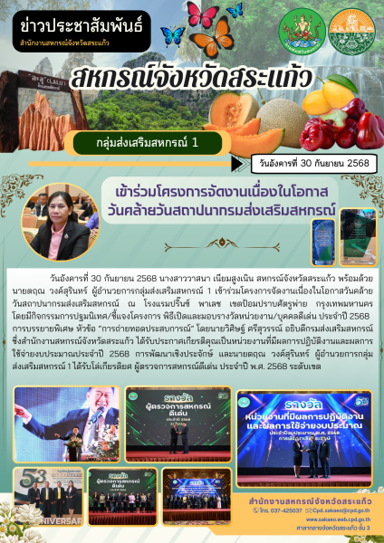 วันอังคารที่ 30 กันยายน 2568 นางสาววาสนา เนียมสูงเนิน สหกรณ์จังหวัดสระแก้ว พร้อมด้วยนายตฤณ วงค์สุรินทร์ ผู้อำนวยการกลุ่มส่งเสริมสหกรณ์ 1 เข้าร่วมโครงการจัดงานเนื่องในโอกาสวันคล้ายวันสถาปนากรมส่งเสริมสหกรณ์ ณ โรงแรมปริ๊นซ์ พาเลซ เขตป้อมปราบศัตรูพ่าย กรุงเทพมหานคร โดยมีกิจกรรมการปฐมนิเทศ/ชี้แจงโครงการ พิธีเปิดและมอบรางวัลหน่วยงาน/บุคคลดีเด่น ประจำปี 2568 การบรรยายพิเศษ หัวข้อ “การถ่ายทอดประสบการณ์” โดยนายวิศิษฐ์ ศรีสุวรรณ์ อธิบดีกรมส่งเสริมสหกรณ์ ซึ่งสำนักงานสหกรณ์จังหวัดสระแก้ว ได้รับประกาศเกียรติคุณเป็นหน่วยงานที่มีผลการปฏิบัติงานและผลการใช้จ่ายงบประมาณประจำปี 2568 การพัฒนาเชิงประจักษ์ และนายตฤณ วงค์สุรินทร์ ผู้อำนวยการกลุ่ม ส่งเสริมสหกรณ์ 1 ได้รับโล่เกียรติยศ ผู้ตรวจการสหกรณ์ดีเด่น ประจำปี พ.ศ. 2568 ระดับเขต