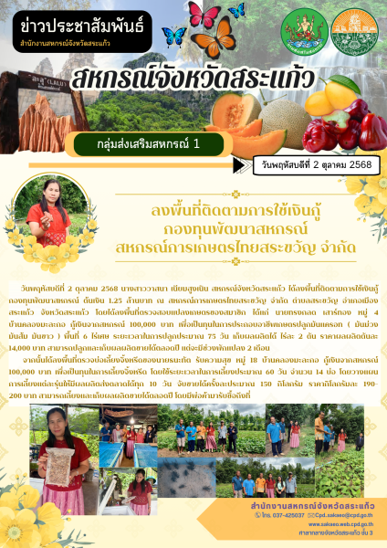 วันพฤหัสบดีที่ 2 ตุลาคม 2568 นางสาววาสนา เนียมสูงเนิน สหกรณ์จังหวัดสระแก้ว ได้ลงพื้นที่ติดตามการใช้เงินกู้กองทุนพัฒนาสหกรณ์ ต้นเงิน 1.25 ล้านบาท ณ สหกรณ์การเกษตรไทยสระขวัญ จำกัด ตำบลสระขวัญ อำเภอเมืองสระแก้ว โดยได้ลงพื้นที่ตรวจสอบแปลงเกษตรของสมาชิก ได้แก่ นายทรงกลด เสาร์ทอง หมู่ 4 บ้านคลองมะละกอ กู้เงินจากสหกรณ์ 100,000 บาท เพื่อเป็นทุนในการประกอบอาชีพเกษตรปลูกมันแครอท( มันม่วง มันส้ม มันขาว ) พื้นที่ 6 ไร่เศษ ระยะเวลาในการปลูกประมาณ 75 วัน เก็บผลผลิตได้ ไร่ละ 2 ตัน ราคาผลผลิตตันละ 14,000 บาท สามารถปลูกและเก็บผลผลิตขายได้ตลอดปีแต่จะมีช่วงพักแปลง 2 เดือน จากนั้นได้ลงพื้นที่ตรวจบ่อเลี้ยงจิ้งหรีดของนายธนะทัต รับความสุข หมู่ 18 บ้านคลองมะละกอ กู้เงินจากสหกรณ์ 100,000 บาท เพื่อเป็นทุนในการเลี้ยงจิ้งหรีด โดยใช้ระยะเวลาในการเลี้ยงประมาณ 60 วัน จำนวน 14 บ่อ โดยวางแผนการเลี้ยงแต่ละรุ่นให้มีผลผลิตส่งตลาดได้ทุก 10 วัน จับขายได้ครั้งละประมาณ 150 กิโลกรัม ราคากิโลกรัมละ 190-200 บาท สามารถเลี้ยงและเก็บผลผลิตขายได้ตลอดปี โดยมีพ่อค้ามารับซื้อถึงที่