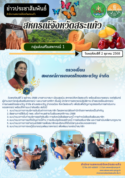 วันพฤหัสบดีที่ 2 ตุลาคม 2568 นางสาววาสนา เนียมสูงเนิน สหกรณ์จังหวัดสระแก้ว พร้อมด้วยนายตฤณ วงค์สุรินทร์ ผู้อำนวยการกลุ่มส่งเสริมสหกรณ์ 1 และนางสาวศศิภา ชื่นอยู่ นักวิชาการสหกรณ์ปฏิบัติการ เข้าตรวจเยี่ยมสหกรณ์การเกษตรไทยสระขวัญ จำกัด ตำบลสระขวัญ อำเภอเมือง จังหวัดสระแก้ว เพื่อรับฟังปัญหาอุปสรรคในการดำเนินงานของสหกรณ์ พร้อมให้คำแนะนำส่งเสริม ต่อไปนี้