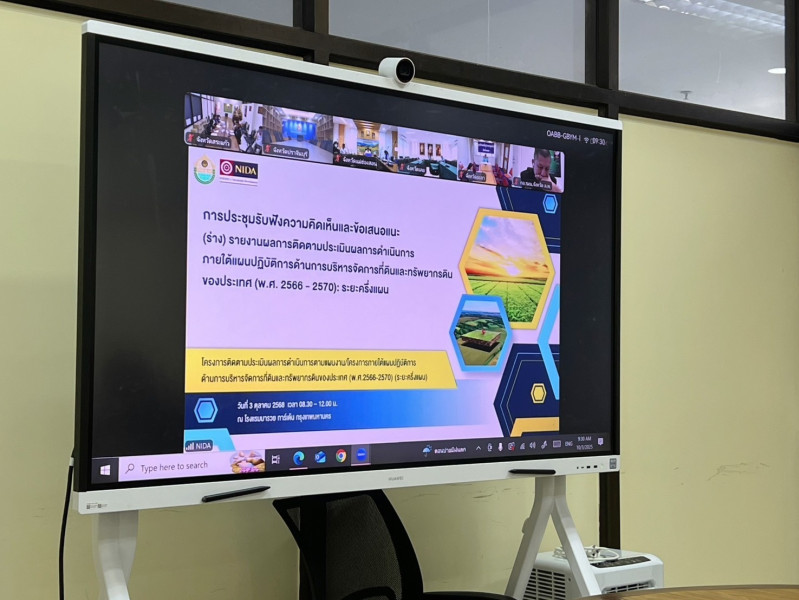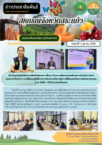 วันศุกร์ที่ 3 ตุลาคม 2568 นางสาววาสนา เนียมสูงเนิน สหกรณ์จังหวัดสระแก้ว อนุกรรมการและเลขานุการร่วม คณะอนุกรรมการนโยบายที่ดินจังหวัดสระแก้ว (คทช.จังหวัดสระแก้ว) เข้าร่วมประชุมรับฟังความคิดเห็นต่อผลการศึกษา โครงการติดตามประเมินผลการดำเนินการตามแผนงาน/โครงการ ภายใต้แผนปฏิบัติราชการด้านการบริหารจัดการที่ดินและทรัพยากรดินของประเทศ (พ.ศ. 2566-2570) (ระยะครึ่งแผน) มีวัตถุประสงค์เพื่อติดตามความก้าวหน้าและประเมินผลสัมฤทธิ์การดำเนินการ พร้อมทั้งจัดทำข้อเสนอแนะต่อ (ร่าง) รายงานผลการติดตามประเมินผลการดำเนินการดังกล่าว ไปสู่การปฏิบัติ โดยรวบรวมข้อมูลจาก สคทช. และหน่วยงานพันธมิตร ผ่านระบบ VDO Conference ณ ห้องประชุมสำนักงานจังหวัดสระแก้ว ชั้น 4 ศาลากลางจังหวัดสระแก้ว ต.ท่าเกษม อ.เมืองสระแก้ว จ.สระแก้ว