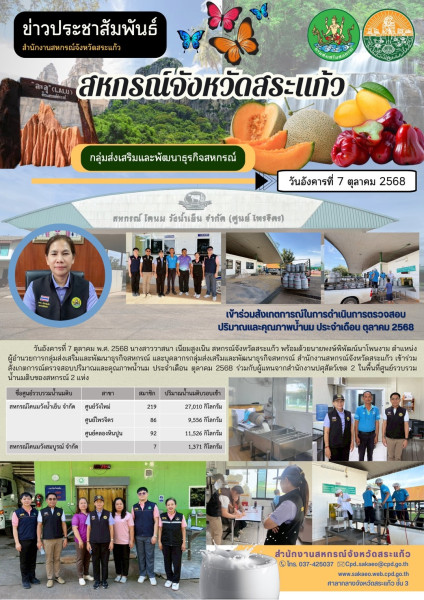 วันอังคารที่ 7 ตุลาคม พ.ศ. 2568 นางสาววาสนา เนียมสูงเนิน สหกรณ์จังหวัดสระแก้ว พร้อมด้วยนายพงษ์พิพัฒน์ นาโพนงาม ตำแหน่งผู้อำนวยการกลุ่มส่งเสริมและพัฒนาธุรกิจสหกรณ์ และบุคลากรกลุ่มส่งเสริมและพัฒนาธุรกิจสหกรณ์ สำนักงานสหกรณ์จังหวัดสระแก้ว เข้าร่วมสังเกตการณ์ตรวจสอบปริมาณและคุณภาพน้ำนม ประจำเดือน ตุลาคม 2568 ร่วมกับผู้แทนจากสำนักงานปศุสัตว์เขต 2 ในพื้นที่ศูนย์รวบรวมน้ำนมดิบของสหกรณ์ 2 แห่ง