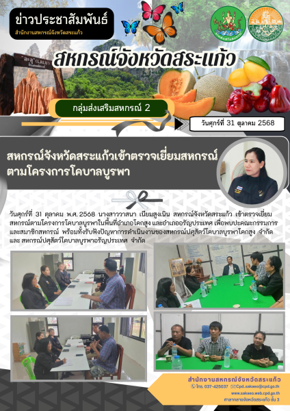 วันศุกร์ที่ 31 ตุลาคม พ.ศ. 2568 นางสาววาสนา เนียมสูงเนิน สหกรณ์จังหวัดสระแก้ว เข้าตรวจเยี่ยมสหกรณ์ตามโครงการโคบาลบูรพาในพื้นที่อำเภอโคกสูง และอำเภออรัญประเทศ เพื่อพบปะคณะกรรมการและสมาชิกสหกรณ์พร้อมทั้งรับฟังปัญหาการดำเนินงานของสหกรณ์ปศุสัตว์โคบาลบูรพาโคกสูง จำกัด และ สหกรณ์ปศุสัตว์โคบาลบูรพาอรัญประเทศ จำกัด