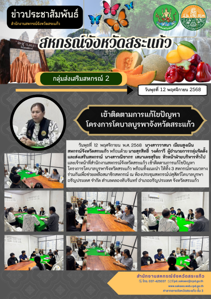 วันพุธที่ 12 พฤศจิกายน พ.ศ. 2568 นางสาววาสนา เนียมสูงเนิน สหกรณ์จังหวัดสระแก้ว พร้อมด้วย นายสุรสิทธิ์ วงศ์กาวี ผู้อำนวยการกลุ่มจัดตั้งและส่งเสริมสหกรณ์ นางสาวณิชากร เสนาเดชสุริยะ หัวหน้าฝ่ายบริหารทั่วไป และเจ้าหน้าที่สำนักงานสหกรณ์จังหวัดสระแก้ว เข้าติดตามการแก้ไขปัญหาโครงการโคบาลบูรพาจังหวัดสระแก้ว พร้อมทั้งแนะนำ ให้ทั้ง 3 สหกรณ์หาแนวทางร่วมกันเพื่อช่วยเหลือสมาชิกสหกรณ์ ณ ห้องประชุมสหกรณ์ปศุสัตว์โคบาลบูรพาอรัญประเทศ จำกัด ตำบลคลองทับจันทร์ อำเภออรัญประเทศ จังหวัดสระแก้ว