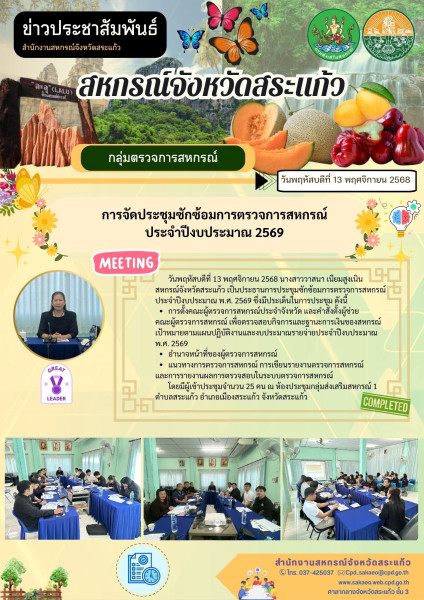 วันพฤหัสบดีที่ 13 พฤศจิกายน 2568 นางสาววาสนา เนียมสูงเนิน สหกรณ์จังหวัดสระแก้ว เป็นประธานการประชุมซักซ้อมการตรวจการสหกรณ์ ประจำปีงบประมาณ พ.ศ. 2569 ซึ่งมีประเด็นในการประชุม ดังนี้ 1. การตั้งคณะผู้ตรวจการสหกรณ์ประจำจังหวัดสระแก้ว และคำสั่งตั้งผู้ช่วยคณะผู้ตรวจการสหกรณ์ เพื่อตรวจสอบกิจการและฐานะการเงินของสหกรณ์เป้าหมายตามแผนปฏิบัติงานและงบประมาณรายจ่ายประจำปีงบประมาณ พ.ศ. 2569 2. อำนาจหน้าที่ของผู้ตรวจการสหกรณ์ 3. แนวทางการตรวจการสหกรณ์ การเขียนรายงานตรวจการสหกรณ์และการรายงานผลการตรวจสอบในระบบตรวจการสหกรณ์ โดยมีผู้เข้าประชุมจำนวน 25 คน ณ ห้องประชุมกลุ่มส่งเสริมสหกรณ์ 1 ตำบลสระแก้ว อำเภอเมืองสระแก้ว จังหวัดสระแก้ว