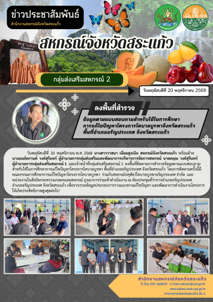 วันพฤหัสบดีที่ 20 พฤศจิกายน พ.ศ. 2568 นางสาววาสนา เนียมสูงเนิน สหกรณ์จังหวัดสระแก้ว พร้อมด้วย นางมนต์ธกานต์ วงค์สุรินทร์ ผู้อำนวยการกลุ่มส่งเสริมและพัฒนาการบริหารการจัดการสหกรณ์ นายตฤณ วงค์สุรินทร์ ผู้อำนวยการกลุ่มส่งเสริมสหกรณ์ 1 และเจ้าหน้าที่กลุ่มส่งเสริมสหกรณ์ 2 ลงพื้นที่สำรวจข้อมูลตามแบบสอบถามสำหรับใช้ในการศึกษาการแก้ไขปัญหาโครงการโคบาลบูรพา พื้นที่อำเภออรัญประเทศ จังหวัดสระแก้ว โดยการสำรวจครั้งนี้มีคณะกรรมการศึกษาการแก้ไขปัญหาโครงการโคบาลบูรพา ร่วมกับสหกรณ์ปศุสัตว์โคบาลบูรพาอรัญประเทศ จำกัด และหน่วยงานในสังกัดกระทรวงเกษตรและสหกรณ์ บูรณาการร่วมเข้าดำเนินงาน ณ ห้องประชุมที่ว่าการอำเภออรัญประเทศ อำเภออรัญประเทศ จังหวัดสระแก้ว เพื่อรวบรวมข้อมูลประกอบการวางแนวทางแก้ไขปัญหาและพัฒนาการดำเนินงานโครงการให้เกิดประสิทธิภาพสูงสุดต่อไป