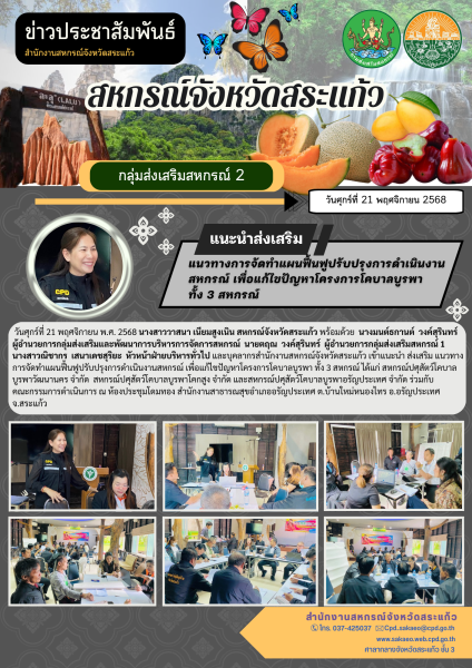 วันศุกร์ที่ 21 พฤศจิกายน พ.ศ. 2568 นางสาววาสนา เนียมสูงเนิน สหกรณ์จังหวัดสระแก้ว พร้อมด้วย นางมนต์ธกานต์ วงค์สุรินทร์ ผู้อำนวยการกลุ่มส่งเสริมและพัฒนาการบริหารการจัดการสหกรณ์ นายตฤณ วงค์สุรินทร์ ผู้อำนวยการกลุ่มส่งเสริมสหกรณ์ 1 นางสาวณิชากร เสนาเดชสุริยะ หัวหน้าฝ่ายบริหารทั่วไป และบุคลากรสำนักงานสหกรณ์จังหวัดสระแก้ว เข้าแนะนำ ส่งเสริม แนวทางการจัดทำแผนฟื้นฟูปรับปรุงการดำเนินงานสหกรณ์ เพื่อแก้ไขปัญหาโครงการโคบาลบูรพา ทั้ง 3 สหกรณ์ ได้แก่ สหกรณ์ปศุสัตว์โคบาลบูรพาวัฒนานคร จำกัด สหกรณ์ปศุสัตว์โคบาลบูรพาโคกสูง จำกัด และสหกรณ์ปศุสัตว์โคบาลบูรพาอรัญประเทศ จำกัด ร่วมกับคณะกรรมการดำเนินการ ณ ห้องประชุมโดมทอง สำนักงานสาธารณสุขอำเภออรัญประเทศ ต.บ้านใหม่หนองไทร อ.อรัญประเทศ จ.สระแก้ว
