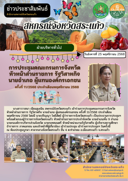 วันอังคารที่ 25 พฤศจิกายน 2568 นางสาววาสนา เนียมสูงเนิน สหกรณ์จังหวัดสระแก้ว เข้าร่วมการประชุมคณะกรมการจังหวัด หัวหน้าส่วนราชการ รัฐวิสาหกิจ นายอำเภอ ผู้แทนองค์กรเอกชน ครั้งที่ 11/2568 ประจำเดือนพฤศจิกายน 2568 โดยมี นายปริญญา โพธิสัตย์ ผู้ว่าราชการจังหวัดสระแก้ว เป็นประธานการประชุมฯ พร้อมด้วยรองผู้ว่าราชการจังหวัดสระแก้ว หัวหน้าส่วนราชการประจำจังหวัด นายอำเภอทั้ง 9 อำเภอ นายกองค์การบริหารส่วนจังหวัด นายกเทศมนตรี หัวหน้าหน่วยงานรัฐวิสาหกิจ ผู้บริหารสถานศึกษา ข้าราชการ ภาคเอกชน และเจ้าหน้าที่ผู้เกี่ยวข้อง เข้าร่วมประชุม เข้าร่วมการประชุมฯ ในครั้งนี้ ณ ห้องประชุมบูรพา ศาลากลางจังหวัดสระแก้ว ชั้น 4 ต.ท่าเกษม อ.เมืองสระแก้ว จ.สระแก้ว