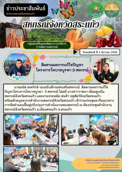 วันพฤหัสบดี ที่ 4 ธันวาคม 2568 นายมนัส เทพรักษ์ รองอธิบดีกรมส่งเสริมสหกรณ์ ติดตามผลการแก้ไขปัญหาโครงการโคบาลบูรพา 3 สหกรณ์ โดยมี นางสาววาสนา เนียมสูงเนิน สหกรณ์จังหวัดสระแก้ว และนายประหยัด เข่งค้า ปศุสัตว์จังหวัดสระแก้ว พร้อมด้วยบุคลากรสำนักงานสหกรณ์จังหวัดสระแก้ว เข้าร่วมประชุมหารือแนวทางการจัดทำแผนฟื้นฟูปรับปรุงการดำเนินงานของสหกรณ์ ณ ห้องประชุมสำนักงานสหกรณ์จังหวัดสระแก้ว อ.เมืองสระแก้ว จ.สระแก้ว