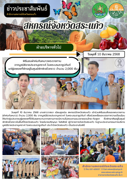 วันพุธที่ 10 ธันวาคม 2568 นางสาววาสนา เนียมสูงเนิน สหกรณ์จังหวัดสระแก้ว เข้าร่วมพิธีมอบสิ่งของพระราชทาน (ผ้าห่มกันหนาว) จำนวน 2,000 ผืน จากมูลนิธิราชประชานุเคราะห์ ในพระบรมราชูปภัมภ์ เพื่อช่วยเหลือและบรรเทาความเดือนร้อนให้แก่กลุ่มประชาชนผู้อพยพที่ได้รับผลกระทบจากสถานการณ์ความไม่สงบตามแนวชายแดนไทย-กัมพูชา ซึ่งพักอาศัยอยู่ในศูนย์พักพิงชั่วคราวในพื้นที่จังหวัดสระแก้ว โดยมีนายปริญญา โพธิสัตย์ ผู้ว่าราชการจังหวัดสระแก้ว ในฐานะประธานกรรมการบริหารมูลนิธิราชประชานุเคราะห์ ในพระบรมราชูปถัมภ์ ประจำจังหวัดสระแก้ว เป็นประธานในพิธี