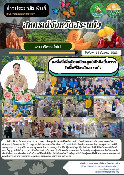 วันจันทร์ที่ 15 ธันวาคม 2568 นางสาววาสนา เนียมสูงเนิน สหกรณ์จังหวัดสระแก้ว พร้อมด้วยนางสาวณิชากร เสนาเดชสุริยะ ตำแหน่ง นักจัดการงานทั่วไปชำนาญการ สำนักงานสหกรณ์จังหวัดสระแก้ว ลงพื้นที่เพื่อเยี่ยมเยียนผู้อพยพ จำนวน 6 ศูนย์ และร่วมพิธีมอบถุงพระราชทาน มูลนิธิราชประชานุเคราะห์ ในพระบรมราชูปถัมภ์ให้แก่ผู้อพยพในศูนย์พักพิงชั่วคราวในพื้นที่จังหวัดสระแก้ว โดยมีนายปริญญา โพธิสัตย์ ผู้ว่าราชการจังหวัดสระแก้ว เป็นประธานในพิธี และมีนายเชาวเนตร ยิ้มประเสริฐ รองผู้ว่าราชการจังหวัดสระแก้ว หัวหน้าส่วนราชการจังหวัดสระแก้วเข้าร่วมพิธีในครั้งนี้ด้วย ทั้งนี้ เพื่อเสริมสร้างขวัญกำลังใจให้แก่ผู้อพยพที่ได้รับผลกระทบจากสถานการณ์ความไม่สงบในพื้นที่ชายแดนไทย–กัมพูชา ณ ศูนย์พักพิงชั่วคราว จังหวัดสระแก้ว
