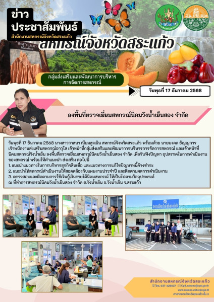 วันพุธที่ 17 ธันวาคม 2568 นางสาววาสนา เนียมสูงเนิน สหกรณ์จังหวัดสระแก้ว พร้อมด้วย นายมงคล ธัญญการเจ้าพนักงานส่งเสริมสหกรณ์อาวุโส เจ้าหน้าที่กลุ่มส่งเสริมและพัฒนาการบริหารการจัดการสหกรณ์ และเจ้าหน้าที่