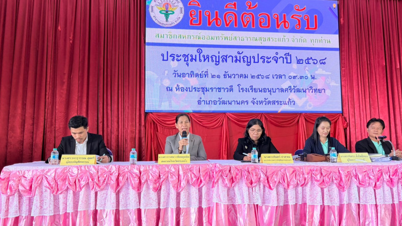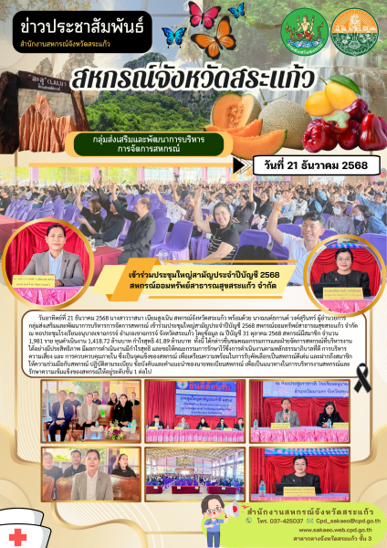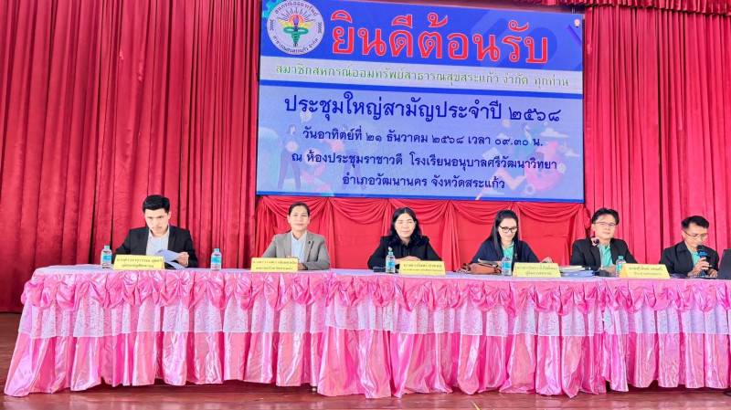 วันอาทิตย์ที่ 21 ธันวาคม 2568 นางสาววาสนา เนียมสูงเนิน สหกรณ์จังหวัดสระแก้ว พร้อมด้วย นางมนต์ธกานต์ วงค์สุรินทร์ ผู้อำนวยการกลุ่มส่งเสริมและพัฒนาการบริหารการจัดการสหกรณ์ เข้าร่วมประชุมใหญ่สามัญประจำปีบัญชี 2568 สหกรณ์ออมทรัพย์สาธารณสุขสระแก้ว จำกัด ณ หอประชุมโรงเรียนอนุบาลเขาฉกรรจ์ อำเภอเขาฉกรรจ์ จังหวัดสระแก้ว โดยข้อมูล ณ ปีบัญชี 31 ตุลาคม 2568 สหกรณ์มีสมาชิกจำนวน 1,981 ราย โดยมีกำไรสุทธิ 41.89 ล้านบาท ทั้งนี้ ได้กล่าวชื่นชมคณะกรรมการและฝ่ายจัดการสหกรณ์ที่บริหารงาน ได้อย่างมีประสิทธิภาพ มีผลการดำเนินงานมีกำไรสุทธิ และขอให้คณะกรรมการรักษาไว้ซึ่งการดำเนินงานตามหลักธรรมาภิบาลที่ดี การบริหารความเสี่ยง และ การควบควบคุมภายใน ซึ่งเป็นจุดแข็งของสหกรณ์ เพื่อเตรียมความพร้อมในการรับคัดเลือกเป็นสหกรณ์ดีเด่น และฝากถึงสมาชิกให้ความร่วมมือกับสหกรณ์ ปฏิบัติตามระเบียบ ข้อบังคับและคำแนะนำของนายทะเบียนสหกรณ์ เพื่อเป็นแนวทางในการบริหารงานสหกรณ์และรักษาความเข้มแข็งของสหกรณ์ให้อยู่ระดับชั้น 1 ต่อไป