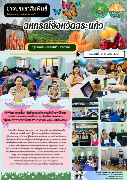 วันจันทร์ที่ 22 ธันวาคม 2568 นางสาววาสนา เนียมสูงเนิน สหกรณ์จังหวัดสระแก้ว พร้อมด้วยนายสุรสิทธิ์ วงศ์กาวี ผู้อำนวยการกลุ่มจัดตั้งและส่งเสริมสหกรณ์, ผู้อำนวยการกลุ่มงานวิชาการ, ผู้อำนวยการกลุ่มส่งเสริมสหกรณ์ และเจ้าหน้าที่ส่งเสริมสหกรณ์ ที่ทำหน้าที่ในการเก็บข้อมูลและบันทึกข้อมูลผ่านระบบรายงานและประเมินความเข้มแข็ง เข้าร่วมรับฟังการชี้แจงซักซ้อมและทำความเข้าใจการใช้งานระบบรายงานและประเมินความเข้มแข็งสหกรณ์และกลุ่มเกษตรกร ผ่านระบบ Application Zoom ทั้งนี้ เพื่อสร้างความเข้าใจและสามารถนำเข้าข้อมูลผ่านระบบรายงานและประเมินความเข้มแข็งสหกรณ์และกลุ่มเกษตรกร ประจำปี 2569 รวมทั้งการรับฟังแนวทางการจัดเก็บข้อมูล และบันทึกข้อมูลผ่านระบบรายงานและประเมินความเข้มแข็งฯ โดยมีนายสุรินทร์ วทัญญู ผู้อำนวยการศูนย์เทคโนโลยีสารสนเทศและการสื่อสาร เป็นประธานในพิธีเปิดการประชุมดังกล่าว โดยถ่ายทอดสัญญาณ จากห้องประชุมศูนย์เทคโนโลยีสารสนเทศและการสื่อสาร กรมส่งเสริมสหกรณ์