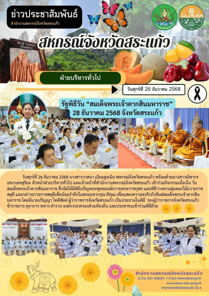 วันศุกร์ที่ 26 ธันวาคม 2568 นางสาววาสนา เนียมสูงเนิน สหกรณ์จังหวัดสระแก้ว พร้อมด้วยนางสาวณิชากร เสนาเดชสุริยะ หัวหน้าฝ่ายบริหารทั่วไป และเจ้าหน้าที่สำนักงานสหกรณ์จังหวัดสระแก้ว เข้าร่วมกิจกรรมเนื่องในวันสมเด็จพระเจ้าตากสินมหาราช ซึ่งจัดให้มีพิธีเจริญพระพุทธมนต์ถวายพระราชกุศล และพิธีวางพานพุ่มดอกไม้ถวายราชสดุดี และกล่าวถวายราชสดุดีเพื่อน้อมรำลึกในพระมหากรุณาธิคุณ เพื่อแสดงความจงรักภักดีแด่สมเด็จพระเจ้าตากสินมหาราช โดยมีนายปริญญา โพธิสัตย์ ผู้ว่าราชการจังหวัดสระแก้ว เป็นประธานในพิธี รองผู้ว่าราชการจังหวัดสระแก้ว ข้าราชการ ตุลาการ ทหาร ตำรวจ องค์กรปกครองส่วนท้องถิ่น และประชาชนเข้าร่วมพิธีด้วย
