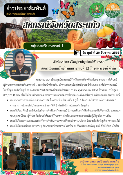 วัน ศุกร์ ที่ 26 ธันวาคม 2568 นางสาววาสนา เนียมสูงเนิน สหกรณ์จังหวัดสระแก้ว พร้อมด้วยนายตฤณ วงค์สุรินทร์ ผู้อำนวยการกลุ่มส่งเสริมสหกรณ์ 1 และเจ้าหน้าที่ส่งเสริม เข้าร่วมประชุมใหญ่สามัญประจำปี 2568 ณ ที่ทำการสหกรณ์ โดยข้อมูล ณ สิ้นปีบัญชี 30 กันยายน 2568 สหกรณ์มีสมาชิกจำนวน 128 คน ทุนดำเนินงาน 20.57 ล้านบาท กำไรสุทธิ 889,320.41 บาท ทั้งนี้ ได้กล่าวชื่นชมคณะกรรมการและฝ่ายจัดการที่ดำเนินงานมีผลกำไรสุทธิ พร้อมแนะนำ ส่งเสริม ดังนี้