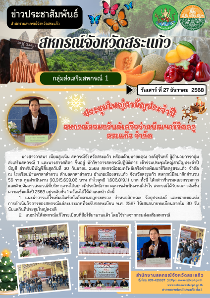 วันเสาร์ที่ 27 ธันวาคม 2568 นางสาววาสนา เนียมสูงเนิน สหกรณ์จังหวัดสระแก้ว พร้อมด้วยนายตฤณ วงค์สุรินทร์ ผู้อำนวยการกลุ่มส่งเสริมสหกรณ์ 1 และนางสาวศศิภา ชื่นอยู่ นักวิชาการสหกรณ์ปฏิบัติการ เข้าร่วมประชุมใหญ่สามัญประจำปีบัญชี สำหรับปีบัญชีสิ้นสุดวันที่ 30 กันยายน 2568 สหกรณ์ออมทรัพย์เครือข่ายพัฒนาชีวิตครูสระแก้ว จำกัด ณ โรงเรียนบ้านศาลาลำดวน ตำบลศาลาลำดวน อำเภอเมืองสระแก้ว จังหวัดสระแก้ว สหกรณ์มีสมาชิกจำนวน 56 ราย ทุนดำเนินงาน 98,915,699.06 บาท กำไรสุทธิ 1,606,819.11 บาท ทั้งนี้ ได้กล่าวชื่นชมคณะกรรมการและฝ่ายจัดการสหกรณ์ที่บริหารงานได้อย่างมีประสิทธิภาพมีผลการดำเนินงานมีกำไรสุทธิ สหกรณ์ได้รับผลการจัดชั้นความเข้มแข็งปี 2568 อยู่ระดับชั้น 1 พร้อมได้ให้คำแนะนำ ดังนี้