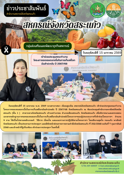 วันพฤหัสบดีที่ 15 มกราคม พ.ศ. 2569 นางสาววาสนา เนียมสูงเนิน สหกรณ์จังหวัดสระแก้ว เข้าร่วมประชุมคณะทำงานโครงการชดเชยดอกเบี้ยในการเก็บสต็อกมันสำปะหลัง ปี 2567/68 จังหวัดสระแก้ว ณ ห้องประชุมสำนักงานพาณิชย์จังหวัดสระแก้ว (ชั้น 1 ) ศาลากลางจังหวัดสระแก้ว ตำบลท่าเกษม อำเภอเมืองสระแก้ว จังหวัดสระแก้ว เพื่อพิจารณาและตรวจสอบเอกสารหลักฐานการขอชดเชยดอกเบี้ยในการเก็บสต็อกมันสำปะหลังโครงการฯของผู้ประกอบการที่เข้าร่วมโครงการฯ จำนวน 4 ราย ให้เป็นไปตามหลักเกณฑ์ วิธีการ เงื่อนไข และแนวทางการปฏิบัติตามโครงการฯ โดยมีนายสุดใจ ทองแก้ว พาณิชย์จังหวัดสระแก้ว เป็นประธานการประชุมฯ และมีหัวหน้าส่วนราชการตามคำสั่งจังหวัดสระแก้ว ที่ 352/2568 ลงวันที่ 7 กุมภาพันธ์ 2568 และเจ้าหน้าที่ผู้เกี่ยวข้อง เข้าร่วมการประชุมฯ ในครั้งนี้