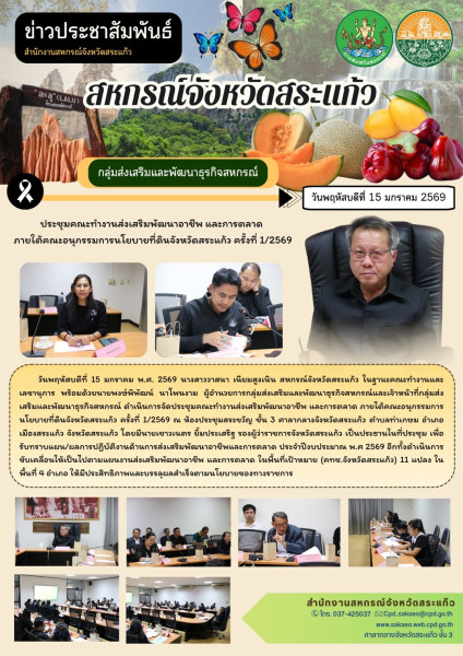 วันพฤหัสบดีที่ 15 มกราคม พ.ศ. 2569 นางสาววาสนา เนียมสูงเนิน สหกรณ์จังหวัดสระแก้ว ในฐานะคณะทำงานและเลขานุการ พร้อมด้วยนายพงษ์พิพัฒน์ นาโพนงาม ผู้อำนวยการกลุ่มส่งเสริมและพัฒนาธุรกิจสหกรณ์และเจ้าหน้าที่กลุ่มส่งเสริมและพัฒนาธุรกิจสหกรณ์ ดำเนินการจัดประชุมคณะทำงานส่งเสริมพัฒนาอาชีพ และการตลาด ภายใต้คณะอนุกรรมการนโยบายที่ดินจังหวัดสระแก้ว ครั้งที่ 1/2569 ณ ห้องประชุมสระขวัญ ชั้น 3 ศาลากลางจังหวัดสระแก้ว ตำบลท่าเกษม อำเภอเมืองสระแก้ว จังหวัดสระแก้ว โดยมีนายเชาวเนตร ยิ้มประเสริฐ รองผู้ว่าราชการจังหวัดสระแก้ว เป็นประธานในที่ประชุม เพื่อรับทราบแผน/ผลการปฏิบัติงานด้านการส่งเสริมพัฒนาอาชีพและการตลาด ประจำปีงบประมาณ พ.ศ 2569 อีกทั้งดำเนินการขับเคลื่อนให้เป็นไปตามแผนงานส่งเสริมพัฒนาอาชีพ และการตลาด ในพื้นที่เป้าหมาย (คทช.จังหวัดสระแก้ว) 11 แปลง ในพื้นที่ 4 อำเภอ ให้มีประสิทธิภาพและบรรลุผลสำเร็จตามนโยบายของทางราชการ