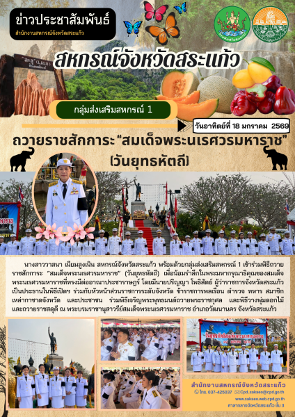 วันอาทิตย์ที่ 18 มกราคม 2569 นางสาววาสนา เนียมสูงเนิน สหกรณ์จังหวัดสระแก้ว พร้อมด้วย ข้าราชการ และเจ้าหน้าที่กลุ่มส่งเสริมสหกรณ์ 1 สำนักงานสหกรณ์จังหวัดสระแก้ว เข้าร่วมพิธีถวายราชสักการะ “สมเด็จพระนเรศวรมหาราช” (วันยุทธหัตถี) เพื่อน้อมรำลึกในพระมหากรุณาธิคุณของสมเด็จพระนเรศวรมหาราชที่ทรงมีต่ออาณาประชาราษฎร์ โดยมีนายปริญญา โพธิสัตย์ ผู้ว่าราชการจังหวัดสระแก้ว เป็นประธานในพิธีเปิดฯ ร่วมกับหัวหน้าส่วนราชการระดับจังหวัด ข้าราชการพลเรือน ตำรวจ ทหาร สมาชิกเหล่ากาชาดจังหวัด และประชาชน ร่วมพิธีเจริญพระพุทธมนต์ถวายพระราชกุศล และพิธีวางพุ่มดอกไม้ และถวายราชสดุดี ณ พระบรมราชานุสาวรีย์สมเด็จพระนเรศวรมหาราช อำเภอวัฒนานคร จังหวัดสระแก้ว