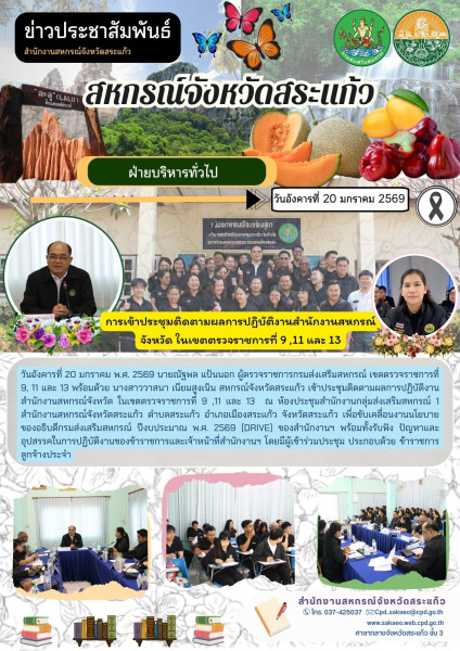 วันอังคารที่ 20 มกราคม พ.ศ. 2569 นายณัฐพล แป้นนอก ผู้ตรวจราชการกรมส่งเสริมสหกรณ์ เขตตรวจราชการที่ 9, 11 และ 13 พร้อมด้วย นางสาววาสนา เนียมสูงเนิน สหกรณ์จังหวัดสระแก้ว เข้าประชุมติดตามผลการปฏิบัติงานสำนักงานสหกรณ์จังหวัด ในเขตตรวจราชการที่ 9 ,11 และ 13 ณ ห้องประชุมสำนักงานกลุ่มส่งเสริมสหกรณ์ 1 สำนักงานสหกรณ์จังหวัดสระแก้ว ตำบลสระแก้ว อำเภอเมืองสระแก้ว จังหวัดสระแก้ว เพื่อขับเคลื่อนงานนโยบายของอธิบดีกรมส่งเสริมสหกรณ์ ปีงบประมาณ พ.ศ. 2569 (DRIVE) ของสำนักงานฯ พร้อมทั้งรับฟัง ปัญหาและอุปสรรคในการปฏิบัติงานของข้าราชการและเจ้าหน้าที่สำนักงานฯ โดยมีผู้เข้าร่วมประชุม ประกอบด้วย ข้าราชการ ลูกจ้างประจำ และพนักงานราชการ สำนักงานสหกรณ์จังหวัดสระแก้ว รวมทั้งสิ้น จำนวน 55 คน