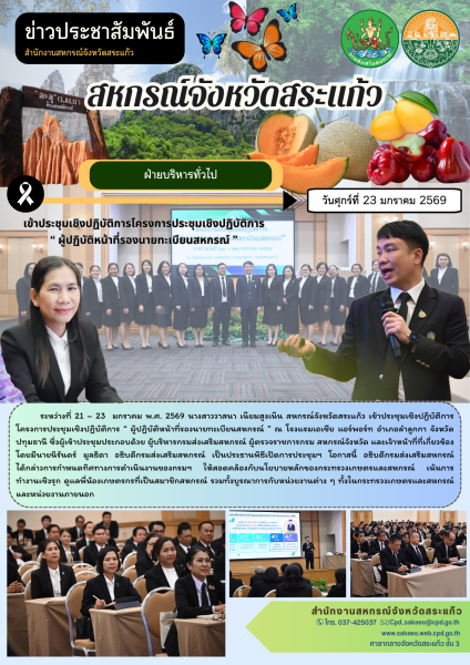 ระหว่างที่ 21 – 23 มกราคม พ.ศ. 2569 นางสาววาสนา เนียมสูงเนิน สหกรณ์จังหวัดสระแก้ว เข้าประชุมเชิงปฏิบัติการโครงการประชุมเชิงปฏิบัติการ “ ผู้ปฏิบัติหน้าที่รองนายทะเบียนสหกรณ์ ” ณ โรงแรมเอเชีย แอร์พอร์ท อำเภอลำลูกกา จังหวัดปทุมธานี ซึ่งผู้เข้าประชุมประกอบด้วย ผู้บริหารกรมส่งเสริมสหกรณ์ ผู้ตรวจราชการกรม สหกรณ์จังหวัด และเจ้าหน้าที่ที่เกี่ยวข้อง โดยมีนายนิรันดร์ มูลธิดา อธิบดีกรมส่งเสริมสหกรณ์ เป็นประธานพิธีเปิดการประชุมฯ โอกาสนี้ อธิบดีกรมส่งเสริมสหกรณ์ ได้กล่าวการกำหนดทิศทางการดำเนินงานของกรมฯ ให้สอดคล้องกับนโยบายหลักของกระทรวงเกษตรและสหกรณ์ เน้นการทำงานเชิงรุก ดูแลพี่น้องเกษตรกรที่เป็นสมาชิกสหกรณ์ รวมทั้งบูรณาการกับหน่วยงานต่าง ๆ ทั้งในกระทรวงเกษตรและสหกรณ์และหน่วยงานภายนอก