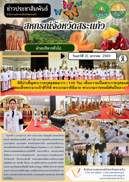 วันเสาร์ที่ 31 มกราคม พ.ศ. 2569 นางสาววาสนา เนียมสูงเนิน สหกรณ์จังหวัดสระแก้ว พร้อมด้วยนายสุรสิทธิ์ วงศ์กาวี ผู้อำนวยการกลุ่มจัดตั้งและส่งเสริมสหกรณ์ นางสาวณิชากร เสนาเดชสุริยะ หัวหน้าฝ่ายบริหารทั่วไป และเจ้าหน้าที่สำนักงานสหกรณ์จังหวัดสระแก้ว เข้าร่วมพิธีบำเพ็ญพระราชกุศลสตมวาร (100 วัน) เพื่อถวายเป็นพระราชกุศลแด่สมเด็จพระนางเจ้าสิริกิติ์ พระบรมราชินีนาถ พระบรมราชชนนีพันปีหลวง ณ ศาลาการเปรียญวัดสระแก้ว พระอารามหลวง อำเภอเมืองสระแก้ว จังหวัดสระแก้ว ซึ่งประกอบด้วยพิธีสวดพระพุทธมนต์เพื่อถวายเป็นพระราชกุศล เจริญจิตตภาวนา รักษาศีล ฟังธรรม และปฏิบัติธรรมด้วยความจงรักภักดี สำนึกในพระมหากรุณาธิคุณอันหาที่สุดมิได้ โดยมีนายปริญญา โพธิสัตย์ ผู้ว่าราชการจังหวัดสระแก้ว เป็นประธานในพิธีบำเพ็ญฯ และมีมีหัวหน้าส่วนราชการประจำจังหวัด นายอำเภอ นายกองค์การบริหารส่วนจังหวัด นายกเทศมนตรี และประชาชน เข้าร่วมพิธี ในครั้งนี้ด้วย