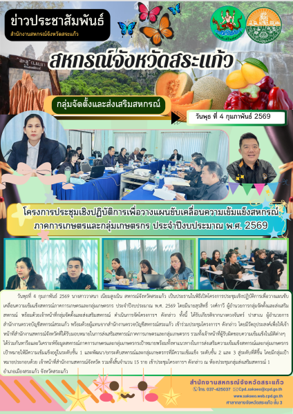วันพุธที่ 4 กุมภาพันธ์ 2569 นางสาววาสนา เนียมสูงเนิน สหกรณ์จังหวัดสระแก้วเป็นประธานในพิธีเปิดโครงการประชุมเชิงปฏิบัติการเพื่อวางแผนขับเคลื่อนความเข้มแข็งสหกรณ์ภาคการเกษตรและกลุ่มเกษตรกร ประจำปีงบประมาณ พ.ศ. 2569 โดยมีนายสุรสิทธิ์ วงศ์กาวีผู้อำนวยการกลุ่มจัดตั้งและส่งเสริมสหกรณ์ พร้อมด้วยเจ้าหน้าที่กลุ่มจัดตั้งและส่งเสริมสหกรณ์ ดำเนินการจัดโครงการฯ ดังกล่าว ทั้งนี้ ได้รับเกียรติจากนางดวงจันทร์ ปาสาเน ผู้อำนวยการสำนักงานตรวจบัญชีสหกรณ์สระแก้ว พร้อมด้วยผู้แทนจากสำนักงานตรวจบัญชีสหกรณ์สระแก้ว เข้าร่วมประชุมโครงการฯ ดังกล่าว โดยมีวัตถุประสงค์เพื่อให้เจ้าหน้าที่สำนักงานสหกรณ์จังหวัด ที่ได้รับมอบหมายในการส่งเสริมสหกรณ์ภาคการเกษตรและกลุ่มเกษตรกร รวมทั้งเจ้าหน้าที่ผู้รับผิดชอบความเข้มแข็งในมิติต่างๆ ได้ร่วมกันหารือและวิเคราะห์ข้อมูลสหกรณ์ภาคการเกษตรและกลุ่มเกษตรกรเป้าหมาย พร้อมทั้งหาแนวทางในการส่งเสริมความเข้มแข็งสหกรณ์และกลุ่มเกษตรกรเป้าหมายให้มีความเข้มแข็งอยู่ในระดับชั้น 1 และพัฒนา/ยกระดับสหกรณ์และกลุ่มเกษตรกรที่มีความเข้มแข็ง ระดับชั้น 2 และ 3 สู่ระดับที่ดีขึ้น โดยมีกลุ่มเป้าหมายประกอบด้วย เจ้าหน้าที่สำนักงานสหกรณ์จังหวัด รวมทั้งสิ้นจำนวน 15 ราย เข้าประชุมโครงการฯ ดังกล่าว ณ ห้องประชุมกลุ่มส่งเสริมสหกรณ์ 1 อำเภอเมืองสระแก้ว จังหวัดสระแก้ว