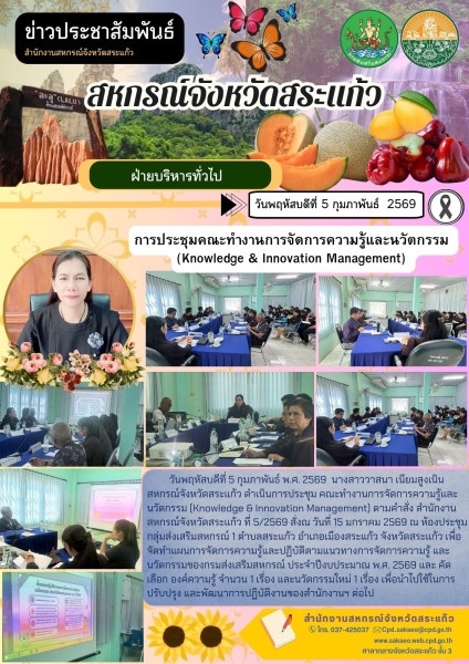 วันพฤหัสบดีที่ 5 กุมภาพันธ์ พ.ศ. 2569 นางสาววาสนา เนียมสูงเนิน สหกรณ์จังหวัดสระแก้วดำเนินการประชุมคณะทำงานการจัดการความรู้และนวัตกรรม (Knowledge & Innovation Management) ตามคำสั่งสำนักงานสหกรณ์จังหวัดสระแก้ว ที่ 5/2569 สั่ง ณ วันที่ 15 มกราคม 2569 ณ ห้องประชุมกลุ่มส่งเสริมสหกรณ์ 1 ตำบลสระแก้ว อำเภอเมืองสระแก้ว จังหวัดสระแก้ว เพื่อจัดทำแผนการจัดการความรู้ และปฏิบัติตามแนวทางการจัดการความรู้และนวัตกรรมของกรมส่งเสริมสหกรณ์ ประจำปีงบประมาณ พ.ศ. 2569 และคัดเลือกองค์ความรู้ จำนวน 1 เรื่อง และนวัตกรรมใหม่ 1 เรื่อง เพื่อนำไปใช้ในการปรับปรุงและพัฒนา การปฏิบัติงานของสำนักงานฯ ต่อไป
