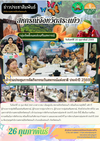 ันจันทร์ที่ 16 กุมภาพันธ์ 2569 นางสาววาสนา เนียมสูงเนิน สหกรณ์จังหวัดสระแก้ว พร้อมด้วยนายสุรสิทธิ์ วงศ์กาวี ผู้อำนวยการกลุ่มจัดตั้งและส่งเสริมสหกรณ์, ผู้อำนวยการกลุ่มงานวิชาการ, ผู้อำนวยการกลุ่มส่งเสริมสหกรณ์, หัวหน้าฝ่ายบริหารทั่วไป และบุคลากรสำนักงานสหกรณ์จังหวัดสระแก้ว เข้าร่วมประชุมการจัดกิจกรรมวันสหกรณ์แห่งชาติ ประจำปี 2569 ทั้งนี้ เพื่อเป็นการเตรียมความพร้อมในการจัดกิจกรรม พร้อมทั้งร่วมกันพิจารณากำหนดการ และมอบหมายหน้าที่ ในการจัดงานวันสหกรณ์แห่งชาติ ประจำปี 2569 ณ ห้องประชุมสำนักงานสหกรณ์จังหวัดสระแก้ว อำเภอเมืองสระแก้ว จังหวัดสระแก้ว