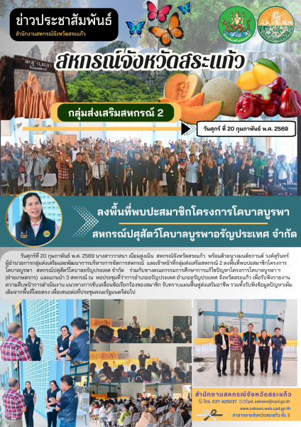 วันศุกร์ที่ 20 กุมภาพันธ์ พ.ศ. 2569 นางสาววาสนา เนียมสูงเนิน สหกรณ์จังหวัดสระแก้ว พร้อมด้วย นางมนต์ธกานต์ วงค์สุรินทร์ ผู้อำนวยการกลุ่มส่งเสริมและพัฒนาการบริหารการจัดการสหกรณ์ และเจ้าหน้าที่กลุ่มส่งเสริมสหกรณ์ 2 ลงพื้นที่พบปะสมาชิกโครงการโคบาลบูรพา สหกรณ์ปศุสัตว์โคบาลอรัญประเทศ จำกัด ร่วมกับทางคณะกรรมการศึกษาการแก้ไขปัญหาโครงการโคบาลบูรพา ฯ (ฝ่ายเกษตรกร) และแกนนำ 3 สหกรณ์ ณ หอประชุมที่ว่าการอำเภออรัญประเทศ อำเภออรัญประเทศ จังหวัดสระแก้ว เพื่อรับฟังรายงานความคืบหน้าการดำเนินงาน แนวทางการขับเคลื่อนข้อเรียกร้องของสมาชิก รับทราบแผนฟื้นฟูส่งเสริมอาชีพ รวมทั้งรับฟังข้อมูลปัญหาเพิ่มเติมจากพื้นที่โดยตรง เพื่อเสนอต่อที่ประชุมคณะรัฐมนตรีต่อไป