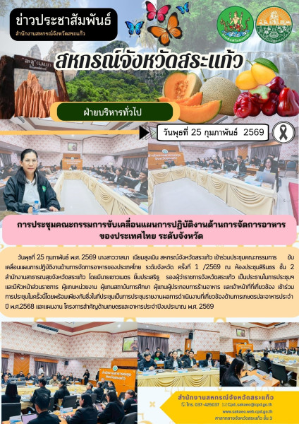 วันพุธที่ 25 กุมภาพันธ์ พ.ศ. 2569 นางสาววาสนา เนียมสูงเนิน สหกรณ์จังหวัดสระแก้วเข้าร่วมประชุมคณะกรรมการขับเคลื่อนแผนการปฏิบัติงานด้านการจัดการอาหารของประเทศไทย ระดับจังหวัด ครั้งที่ 1 /2569 ณ ห้องประชุมสิรินธร ชั้น 2 สำนักงานสาธารณสุขจังหวัดสระแก้ว โดยมีนายเชาวเนตร ยิ้มประเสริฐ รองผู้ว่าราชการจังหวัดสระแก้ว เป็นประธานในการประชุมฯ และมีหัวหน้าส่วนราชการ ผู้แทนหน่วยงาน ผู้แทนสถาบันการศึกษา ผู้แทนผู้ประกอบการร้านอาหาร และเจ้าหน้าที่ที่เกี่ยวข้อง เข้าร่วมการประชุมในครั้งนี้โดยพร้อมเพียงกัน ซึ่งในที่ประชุมเป็นการประชุมรายงานผลการดำเนินงานที่เกี่ยวข้องด้านการเกษตรปละอาหารประจำปี พ.ศ. 2568 และแผนงานโครงการสำคัญด้านเกษตรและอาหารประจำปีงบประมาณ พ.ศ. 2569