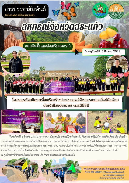 วันพฤหัสบดีที่ 5 มีนาคม 2569 นางสาววาสนา เนียมสูงเนิน สหกรณ์จังหวัดสระแก้ว เป็นประธานพิธีเปิดโครงการทัศนศึกษาเพื่อเสริมสร้างประสบการณ์ด้านการสหกรณ์แก่นักเรียนที่เป็นคณะกรรมการสหกรณ์นักเรียน ประจำปีงบประมาณ พ.ศ.2569 จัดโดยกลุ่มจัดตั้งและส่งเสริมสหกรณ์ การทำกิจกรรมในฐานการเรียนรู้เป็นลักษณะกิจกรรม walk rally ประกอบไปด้วยกิจกรรมการนำกระบือไปใช้ในการเกษตรกรรม กิจกรรมการปั้นดินเผา กิจกรรมการทำน้ำหมักจุลินทรีย์ กิจกรรมการปลูกผักไฮโดรโปนิกส์ ณ โรงเรียนกาสรกสิวิทย์ และศึกษาการบริหารการจัดการสินค้า ณ ศูนย์การค้าบิ๊กซีซูเปอร์เซ็นเตอร์ สาขาสระแก้ว อำเภอเมืองสระแก้ว จังหวัดสระแก้ว