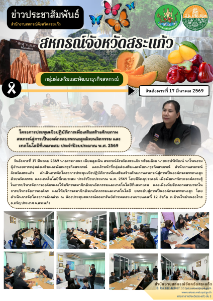วันอังคารที่ 17 มีนาคม 2569 นางสาววาสนา เนียมสูงเนิน สหกรณ์จังหวัดสระแก้ว พร้อมด้วย นายพงษ์พิพัฒน์ นาโพนงาม ผู้อำนวยการกลุ่มส่งเสริมและพัฒนาธุรกิจสหกรณ์ และเจ้าหน้าที่กลุ่มส่งเสริมและพัฒนาธุรกิจสหกรณ์ สำนักงานสหกรณ์จังหวัดสระแก้ว ดำเนินการจัดโครงการประชุมเชิงปฏิบัติการเพื่อเสริมสร้างศักยภาพสหกรณ์สู่การเป็นองค์กรสมรรถนะสูงด้วยนวัตกรรม และเทคโนโลยีที่เหมาะสม ประจำปีงบประมาณ พ.ศ. 2569 โดยมีวัตถุประสงค์ เพื่อพัฒนาทักษะองค์ความรู้ในการบริหารจัดการองค์กร และให้บริการสมาชิกด้วยนวัตกรรมและเทคโนโลยีที่เหมาะสม และเพื่อเพิ่มขีดความสามารถในการบริหารจัดการองค์กร และให้บริการสมาชิกด้วยนวัตกรรมและเทคโนโลยี ยกระดับสู่การเป็นองค์กรสมรรถนะสูง โดยดำเนินการจัดโครงการดังกล่าว ณ ห้องประชุมสหกรณ์ออมทรัพย์ตำรวจตระเวนชายแดนที่ 12 จำกัด ตำบลบ้านใหม่หนองไทร อำเภออรัญประเทศ จังหวัดสระแก้ว
