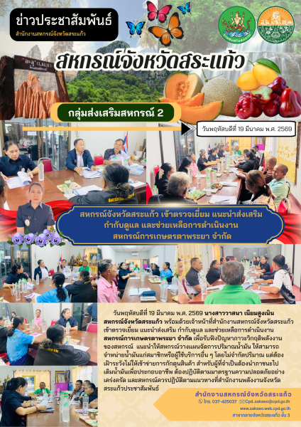 วันพฤหัสบดีที่ 19 มีนาคม พ.ศ. 2569 นางสาววาสนา เนียมสูงเนิน สหกรณ์จังหวัดสระแก้ว พร้อมด้วยเจ้าหน้าที่สำนักงานสหกรณ์จังหวัดสระแก้ว เข้าตรวจเยี่ยม แนะนำส่งเสริม กำกับดูแล และช่วยเหลือการดำเนินงาน สหกรณ์การเกษตรตาพระยา จำกัด เพื่อรับฟังปัญหาภาวะวิกฤติพลังงานของสหกรณ์ แนะนำให้สหกรณ์วางแผนจัดการปริมาณน้ำมัน ให้สามารถจำหน่ายน้ำมันแก่สมาชิกหรือผู้ใช้บริการอื่น ๆ โดยไม่จำกัดปริมาณ แต่ต้องเฝ้าระวังไม่ให้เข้าข่ายการกักตุนสินค้า สำหรับผู้ที่จำเป็นต้องนำภาชนะไปเติมน้ำมันเพื่อประกอบอาชีพ ต้องปฏิบัติตามมาตรฐานความปลอดภัยอย่างเคร่งครัด และสหกรณ์ควรปฏิบัติตามแนวทางที่สำนักงานพลังงานจังหวัดสระแก้วประชาสัมพันธ์
