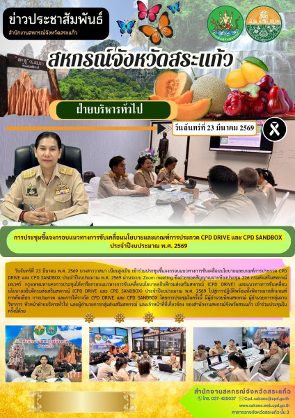 วันจันทร์ที่ 23 มีนาคม พ.ศ. 2569 นางสาววาสนา เนียมสูงเนิน เข้าร่วมประชุมชี้แจงกรอบแนวทางการขับเคลื่อนนโยบายและเกณฑ์การประกวด CPD DRIVE และ CPD SANDBOX ประจำปีงบประมาณ พ.ศ. 2569 ผ่านระบบ Zoom meeting ซึ่งถ่ายทอดสัญญาณจากห้องประชุม 226 กรมส่งเสริมสหกรณ์ เทเวศร์ กรุงเทพมหานคร การประชุมได้หารือกรอบแนวทางการขับเคลื่อนนโยบายอธิบดีกรมส่งเสริมสหกรณ์ (CPD DRIVE) และแนวทางการขับเคลื่อนนโยบายอธิบดีกรมส่งเสริมสหกรณ์ (CPD DRIVE และ CPD SANDBOX) ประจำปีงบประมาณ พ.ศ. 2569 ไปสู่การปฏิบัติพร้อมทั้งพิจารณาหลักเกณฑ์การคัดเลือก การประกวด และการให้รางวัล CPD DRIVE และ CPD SANDBOX โดยการประชุมในครั้งนี้ มีผู้อำนวยนิคมสหกรณ์ ผู้อำนวยการกลุ่มงานวิชาการ หัวหน้าฝ่ายบริหารทั่วไป และผู้อำนวยการกลุ่มส่งเสริมสหกรณ์ และเจ้าหน้าที่ที่เกี่ยวข้อง ของสำนักงานสหกรณ์จังหวัดสระแก้ว เข้าร่วมประชุมในครั้งนี้ด้วย