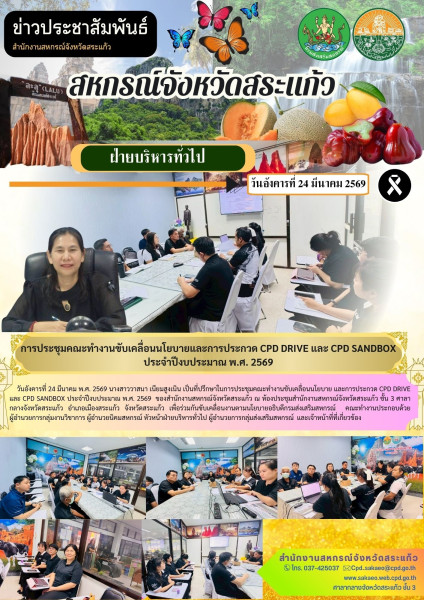 วันอังคารที่ 24 มีนาคม พ.ศ. 2569 นางสาววาสนา เนียมสูงเนิน เป็นที่ปรึกษาในการประชุมคณะทำงานขับเคลื่อนนโยบาย และการประกวด CPD DRIVE และ CPD SANDBOX ประจำปีงบประมาณ พ.ศ. 2569 ของสำนักงานสหกรณ์จังหวัดสระแก้ว ณ ห้องประชุมสำนักงานสหกรณ์จังหวัดสระแก้ว ชั้น 3 ศาลากลางจังหวัดสระแก้ว อำเภอเมืองสระแก้ว จังหวัดสระแก้ว เพื่อร่วมกันขับเคลื่อนงานตามนโยบายอธิบดีกรมส่งเสริมสหกรณ์ คณะทำงานประกอบด้วย ผู้อำนวยการกลุ่มงานวิชาการ ผู้อำนวยนิคมสหกรณ์ หัวหน้าฝ่ายบริหารทั่วไป ผู้อำนวยการกลุ่มส่งเสริมสหกรณ์ และเจ้าหน้าที่ที่เกี่ยวข้อง