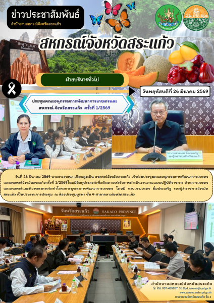 วันพฤหัสบดีที่ 26 มีนาคม 2569 นางสาววาสนา เนียมสูงเนิน สหกรณ์จังหวัดสระแก้ว เข้าร่วมประชุมคณะอนุกรรมการพัฒนาการเกษตรและสหกรณ์จังหวัดสระแก้วครั้งที่ 1/2569 โดยมีวัตถุประสงค์เพื่อติดตามเร่งรัดการดำเนินงานตามแผนปฏิบัติราชการ ด้านการเกษตรและสหกรณ์และพิจารณาการจัดทำโครงการบูรณาการพัฒนาการเกษตร โดยมี นายเชาวเนตร ยิ้มประเสริฐ รองผู้ว่าราชการจังหวัดสระแก้ว เป็นประธานการประชุม ณ ห้องประชุมบูรพา ชั้น 4 ศาลากลางจังหวัดสระแก้ว