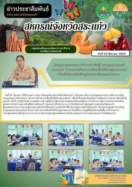 วันจันทร์ที่ 30 มีนาคม 2569 นางสาววาสนา เนียมสูงเนิน สหกรณ์จังหวัดสระแก้ว เป็นประธานในการประชุมคณะกรรมการพิจารณาเงินกู้กองทุนสงเคราะห์เกษตรกร โครงการสร้างความเข้มแข็งให้กับกลุ่มเกษตรกร เพื่อเข้าถึงเเหล่งเงินทุนในการผลิตและการตลาด ระดับจังหวัดสระแก้ว ครั้งที่ 1/2569 โดยมี นางมนต์ธกานต์ วงค์สุรินทร์ ผู้อำนวยการกลุ่มส่งเสริมและพัฒนาการบริหารการจัดการสหกรณ์ พร้อมด้วยผู้แทนจากสำนักงานตรวจบัญชีสหกรณ์สระแก้ว ผู้แทนจากสำนักงาน ธ.ก.ส. จังหวัดสระแก้ว ผู้แทนสภาเกษตรจังหวัดสระแก้วผู้แทนคณะกรรมการกลางกลุ่มเกษตรระดับจังหวัดสระแก้ว และเจ้าหน้าที่สำนักงานสหกรณ์จังหวัดสระแก้ว เข้าร่วมประชุมพิจารณาเงินกู้กองทุนสงเคราะห์เกษตรกร โครงการสร้างความเข้มแข็งให้กับกลุ่มเกษตรกรฯ โดยได้รับการอนุมัติเป็นเงินรวมทั้งสิ้น 3.95 ล้านบาทรวมกลุ่มเกษตรกรที่ขอกู้ จำนวน 8 แห่ง ณ ห้องประชุมกลุ่มส่งเสริมสหกรณ์1 ตำบลสระแก้ว อำเภอเมืองสระแก้ว จังหวัดสระแก้ว
