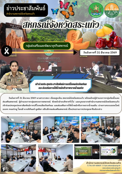 วันอังคารที่ 31 มีนาคม 2569 นางสาววาสนา เนียมสูงเนิน สหกรณ์จังหวัดสระแก้ว พร้อมด้วยผู้อำนวยการกลุ่มจัดตั้งและส่งเสริมสหกรณ์ ผู้อำนวยการกลุ่มตรวจการสหกรณ์ หัวหน้าฝ่ายบริหารทั่วไป และบุคคลากรสำนักงานสหกรณ์จังหวัดสระแก้ว เข้าร่วมประชุมประชาสัมพันธ์การบริโภคผลิตภัณฑ์นม และส่งเสริมการใช้น้ำหมักชีวภาพจากน้ำนมดิบ ผ่านทางระบบออนไลน์ zoom meeting โดยมี นายนิรันดร์ มูลธิดา อธิบดีกรมส่งเสริมสหกรณ์ เป็นประธานการประชุมหารือดังกล่าว
