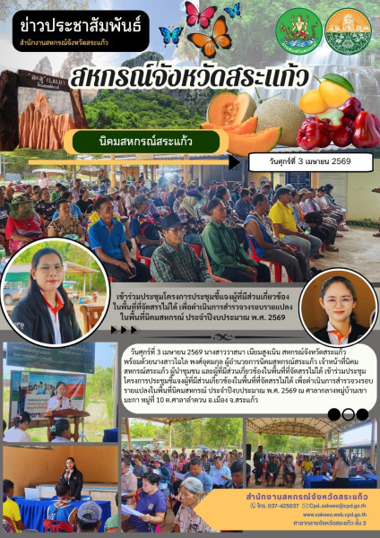 วันศุกร์ที่ 3 เมษายน 2569 นางสาววาสนา เนียมสูงเนิน สหกรณ์จังหวัดสระแก้ว พร้อมด้วยนางสาวไฉไล พงศ์อุดมกุล ผู้อำนวยการนิคมสหกรณ์สระแก้ว เจ้าหน้าที่นิคมสหกรณ์สระแก้ว ผู้นำชุมชน และผู้ที่มีส่วนเกี่ยวข้องในพื้นที่ที่จัดสรรไม่ได้ เข้าร่วมประชุมโครงการประชุมชี้แจงผู้ที่มีส่วนเกี่ยวข้องในพื้นที่ที่จัดสรรไม่ได้ เพื่อดำเนินการสำรวจวงรอบรายแปลงในพื้นที่นิคมสหกรณ์ ประจำปีงบประมาณ พ.ศ. 2569 ณ ศาลากลางหมู่บ้านเขามะกา หมู่ที่ 10 ต.ศาลาลำดวน อ.เมือง จ.สระแก้ว