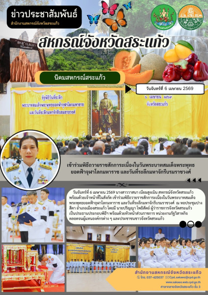 วันจันทร์ที่ 6 เมษายน 2569 นางสาววาสนา เนียมสูงเนิน สหกรณ์จังหวัดสระแก้ว พร้อมด้วยเจ้าหน้าที่ในสังกัด เข้าร่วมพิธีถวายราชสักการะเนื่องในวันพระบาทสมเด็จพระพุทธยอดฟ้าจุฬาโลกมหาราช และวันที่ระลึกมหาจักรีบรมราชวงศ์ ณ หอประชุมปางสีดา อำเภอเมืองสระแก้ว โดยมี นายปริญญา โพธิสัตย์ ผู้ว่าราชการจังหวัดสระแก้ว เป็นประธานประกอบพิธีฯ พร้อมด้วยหัวหน้าส่วนราชการ หน่วยงานรัฐวิสาหกิจ ตลอดจนผู้แทนองค์กรต่าง ๆ และประชาชนชาวจังหวัดสระแก้ว
